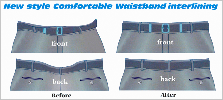 1.本系列商品是普通腰襯的更新換代產品。 2.雙點涂層工藝,粘合溫度低,高粘合度,操作方便,不滲膠,適用于輕薄休閑褲系列。 3.采用彈力絲,有一定的伸縮力。面料貼合度好,具備特殊的隨身性能,可隨人體腰部的變化而變化。 4.本系列產品均使用材料環保,不含任何對人體有害物質。 |